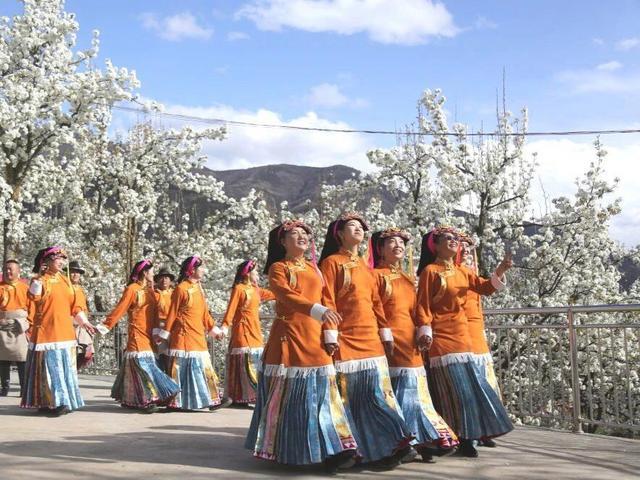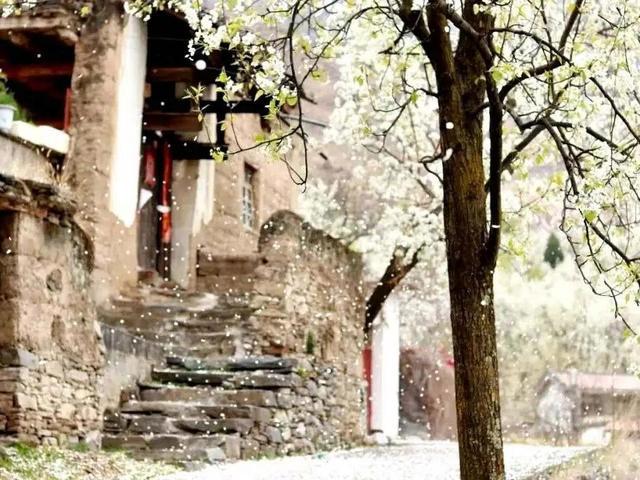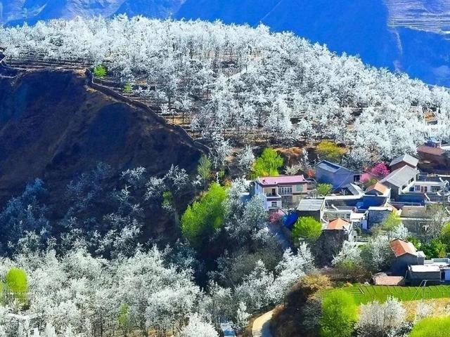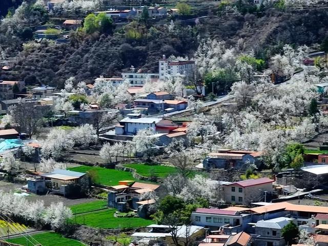 在大金川河谷,这里长达绵延数十公里的古梨树在这里同时绽放,盛开的梨花树与雪山、藏寨、河谷交织在一起,它们共同描绘出一幅画卷。